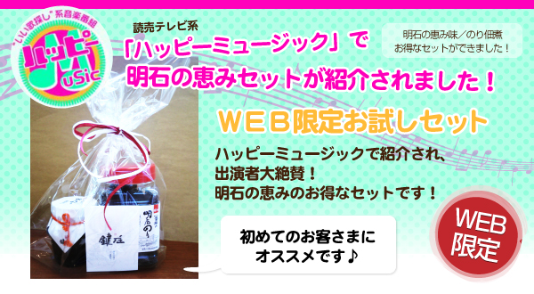 前回、ハッピーミュージックで紹介された事をブログに書かせて頂きましたが、今回はそのハッピーミュージックで紹介された【明石の恵み】と同じくらい人気のある【のり佃煮】のWEB限定セットを紹介したいと思います♪
