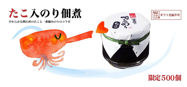 キッチリ包装したギフトをお土産に持っていくのが気を使わせちゃうかなって思っている方は、気軽に持っていける『タコ入のり佃煮』をオススメします。